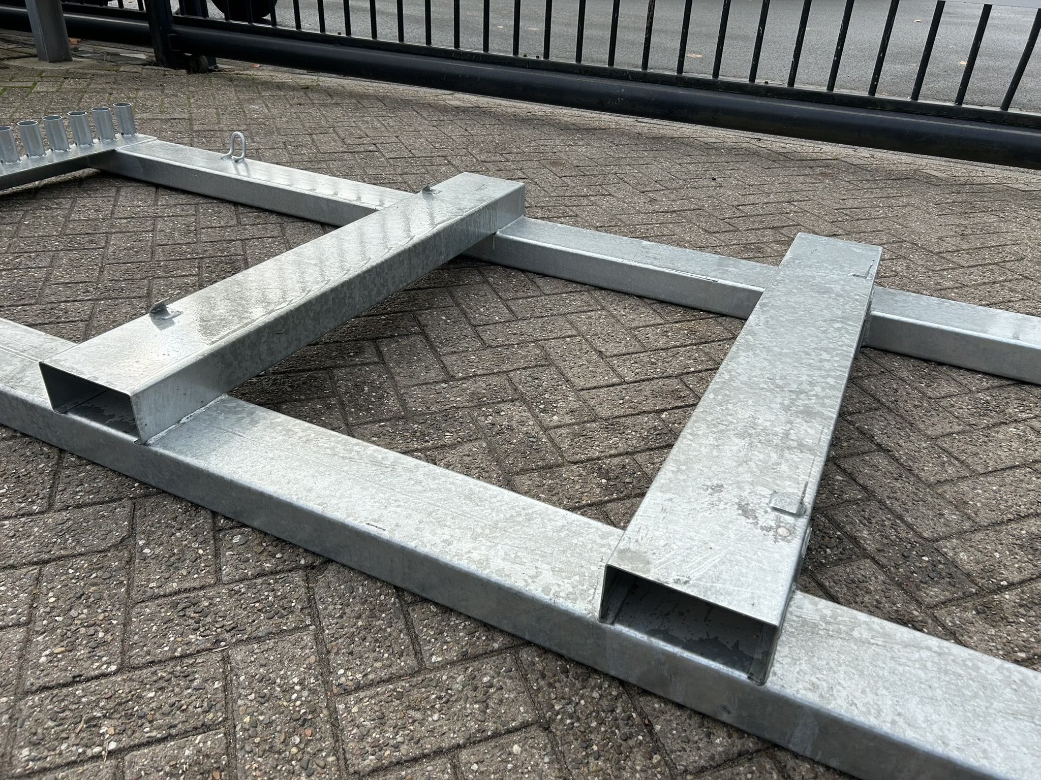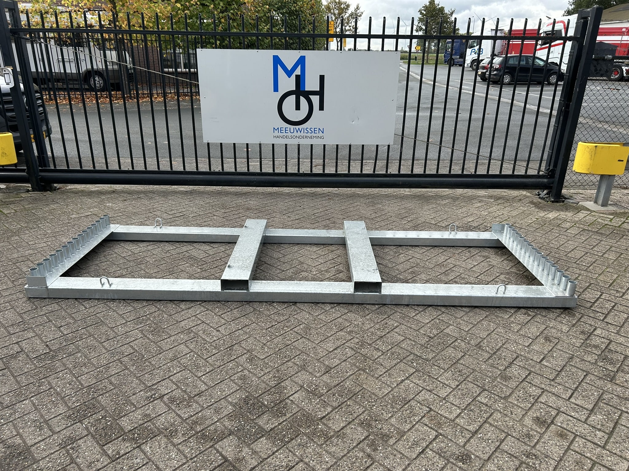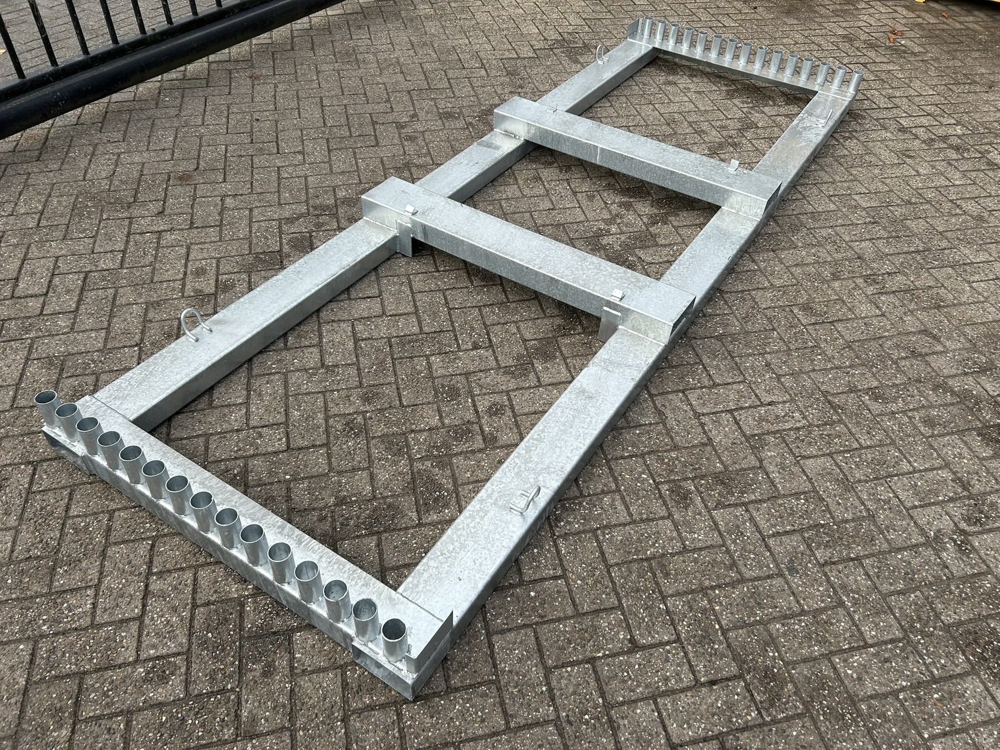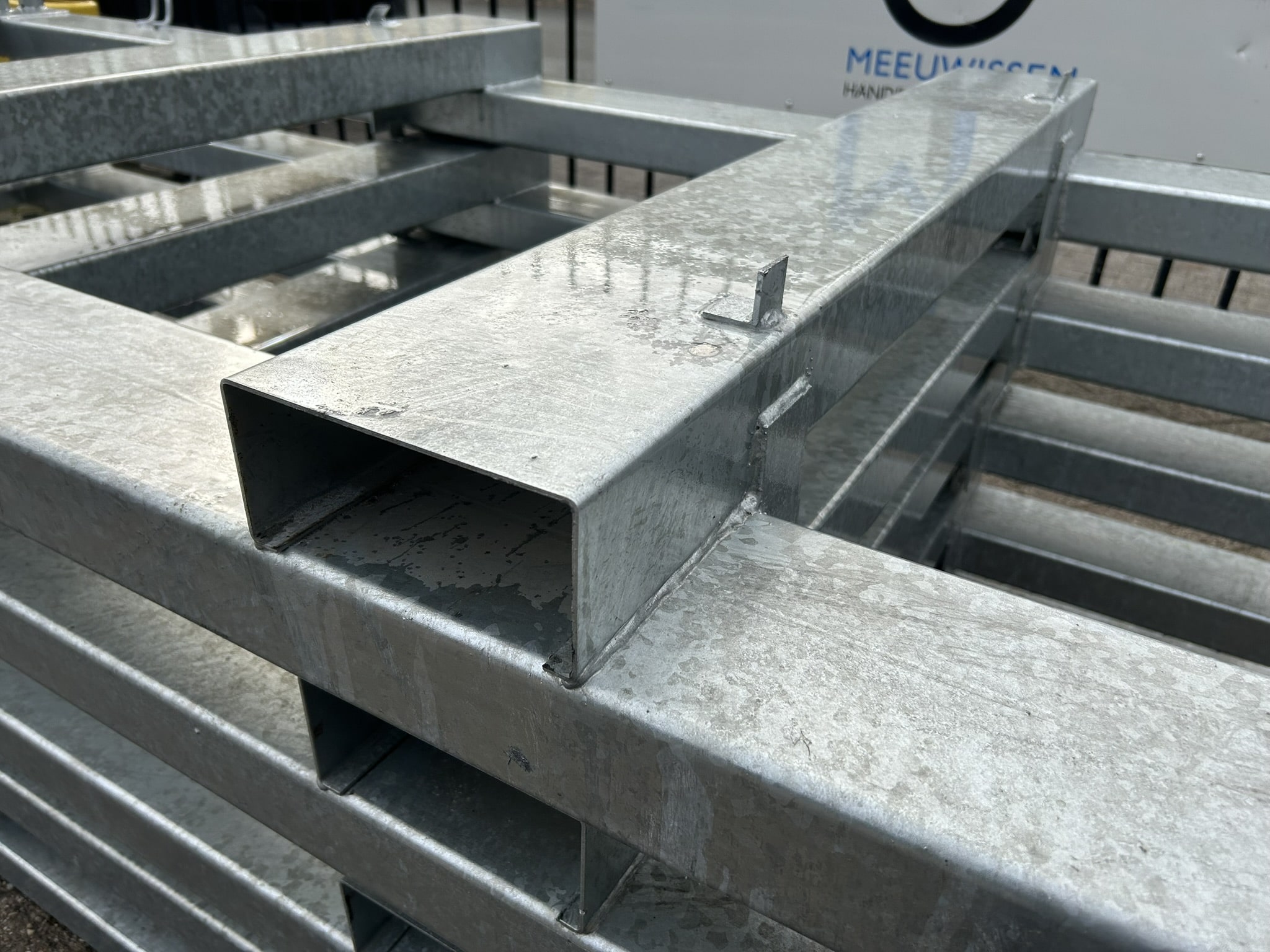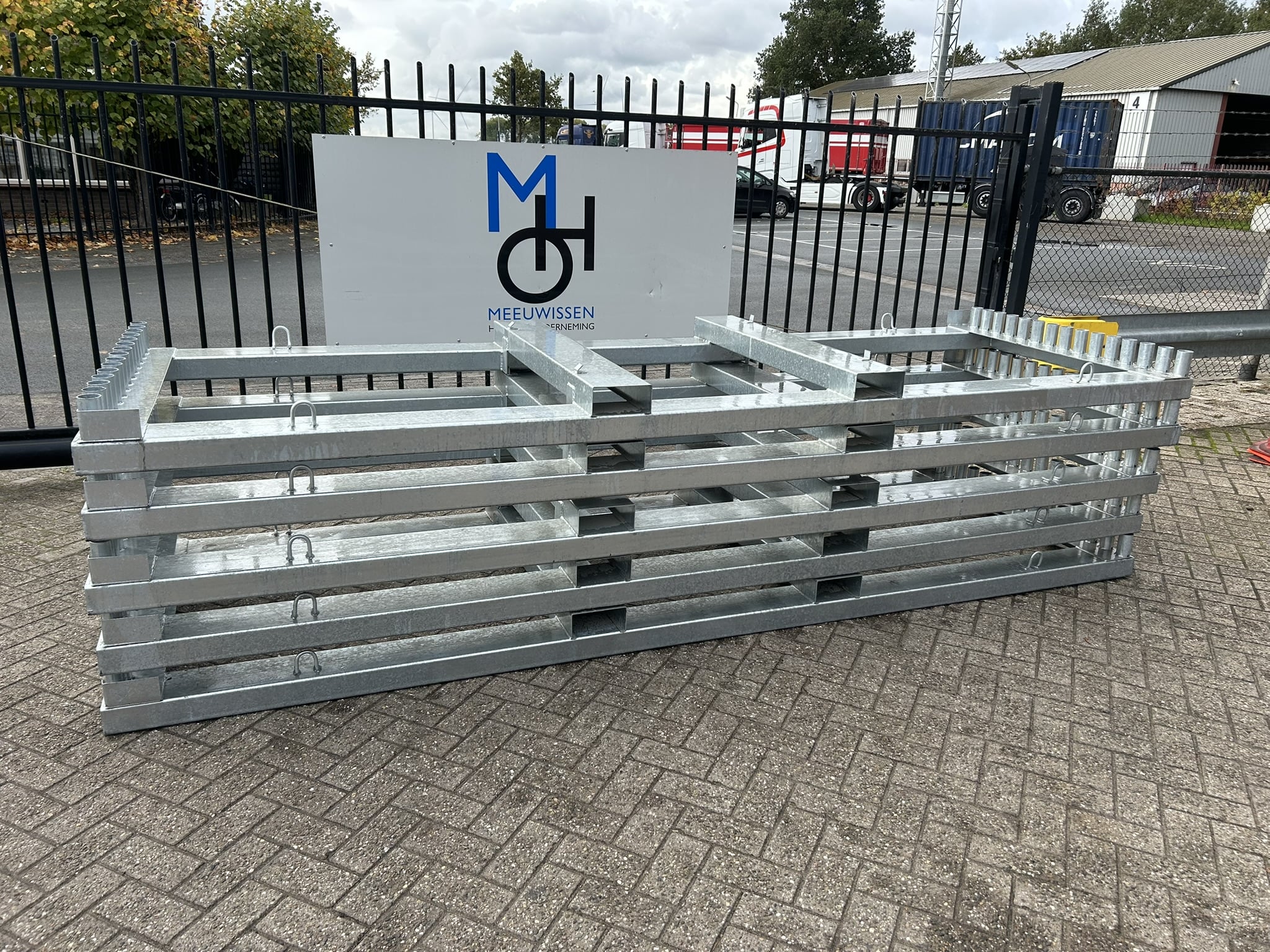 Type: Bouwhek opslagpallet Staat: Nieuw Behandeling: Thermisch verzinkt Capaciteit: 30ST Maximaal laadvermogen: 750KG Eigen gewicht: 100KG (leeg) Lengte: 355CM Breedte: 115CM Hoogte: 20CM