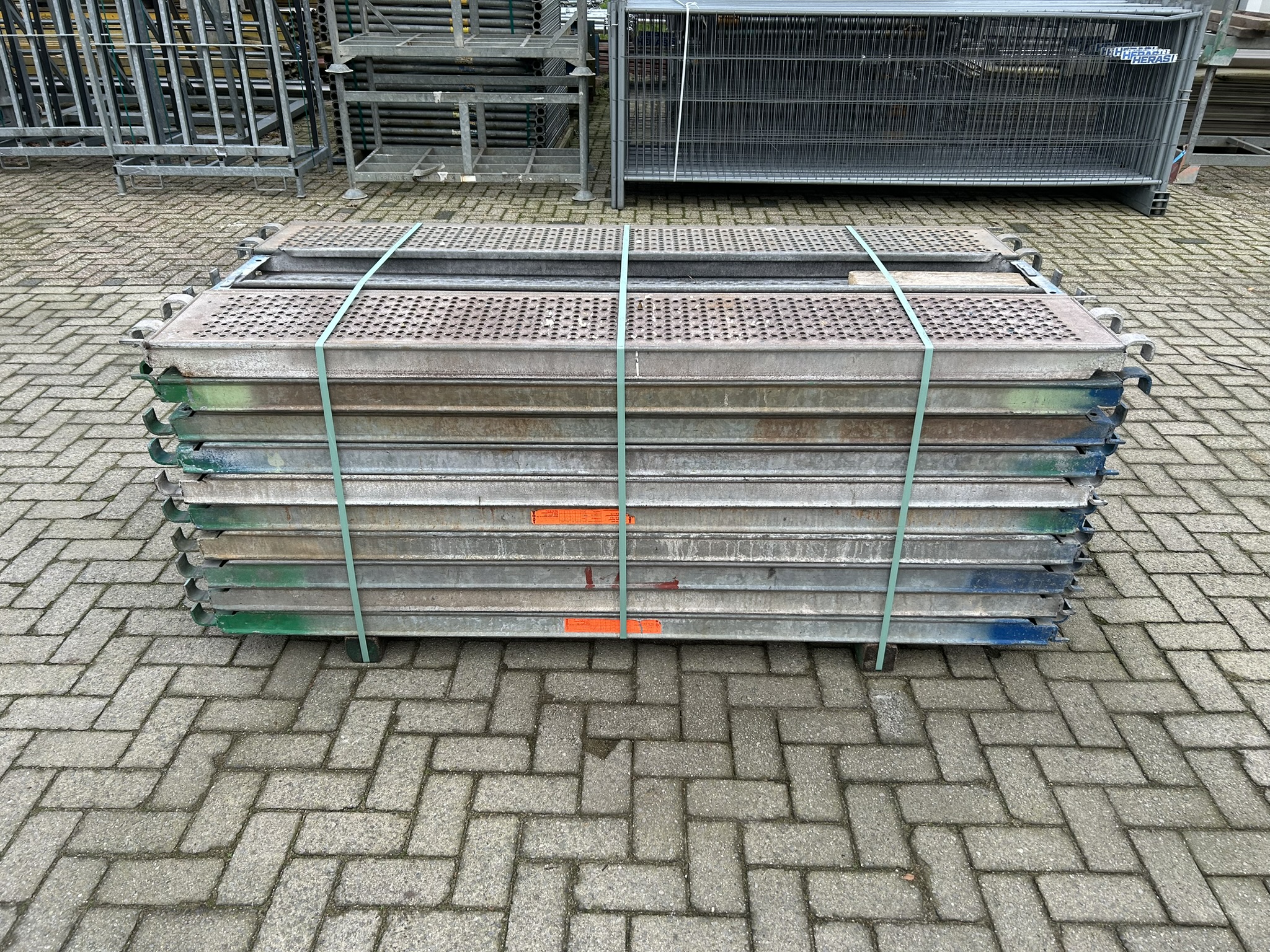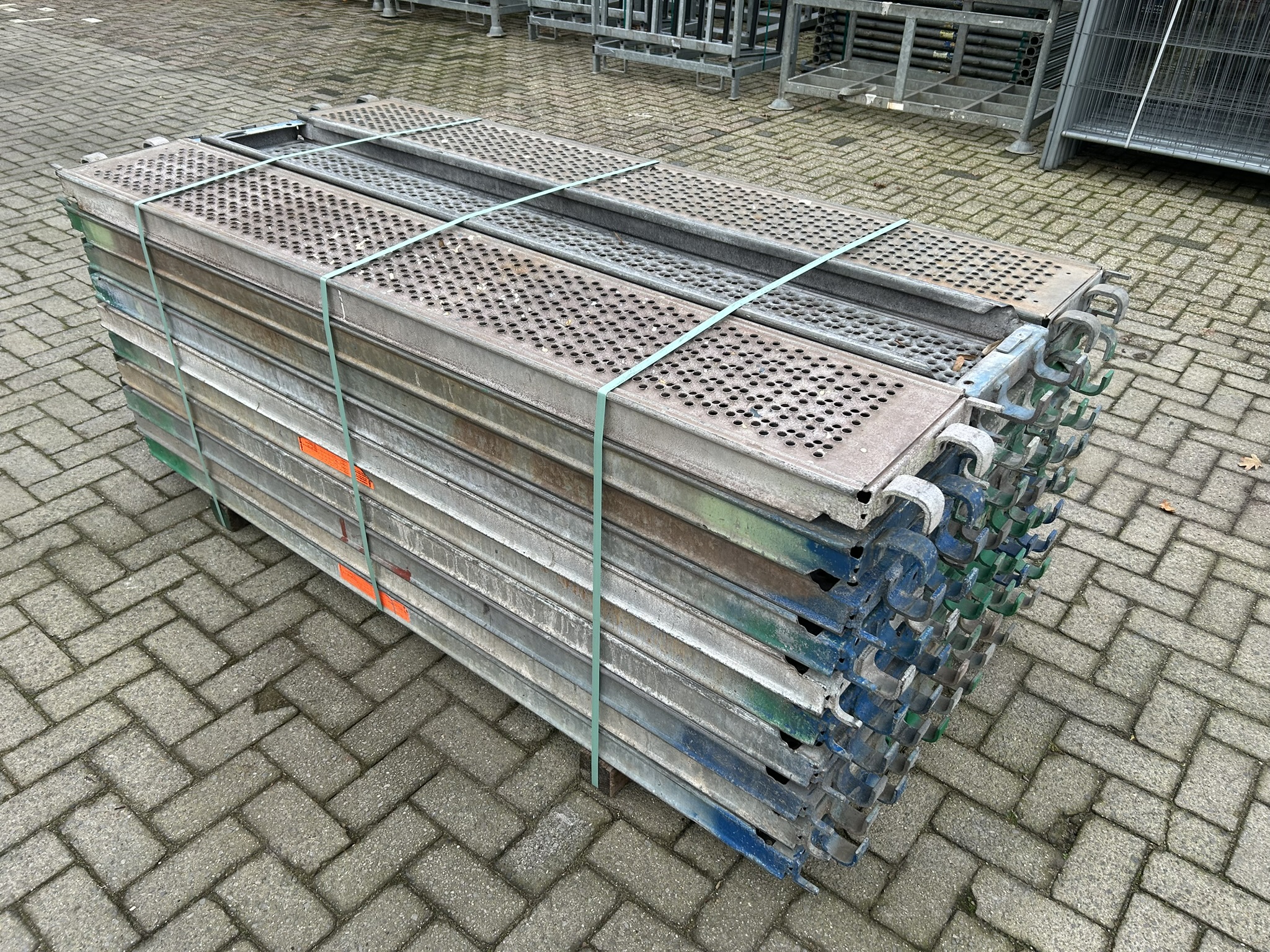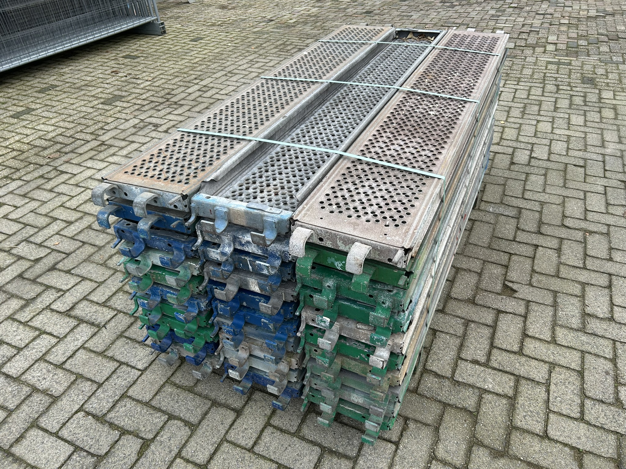 Gebruikte originele Layher Allround 2.07M liggers en roostervloeren, meerdere pakketten beschikbaar.