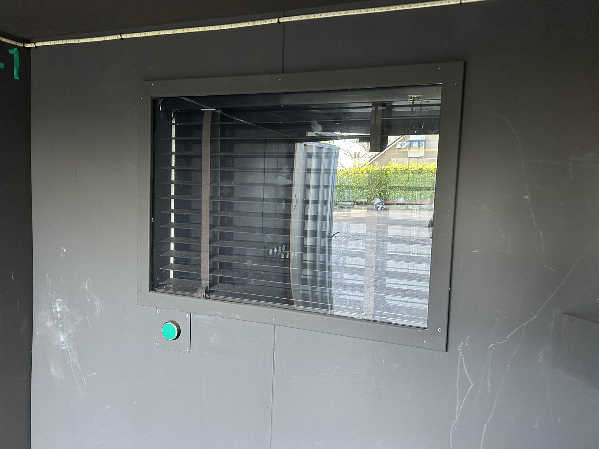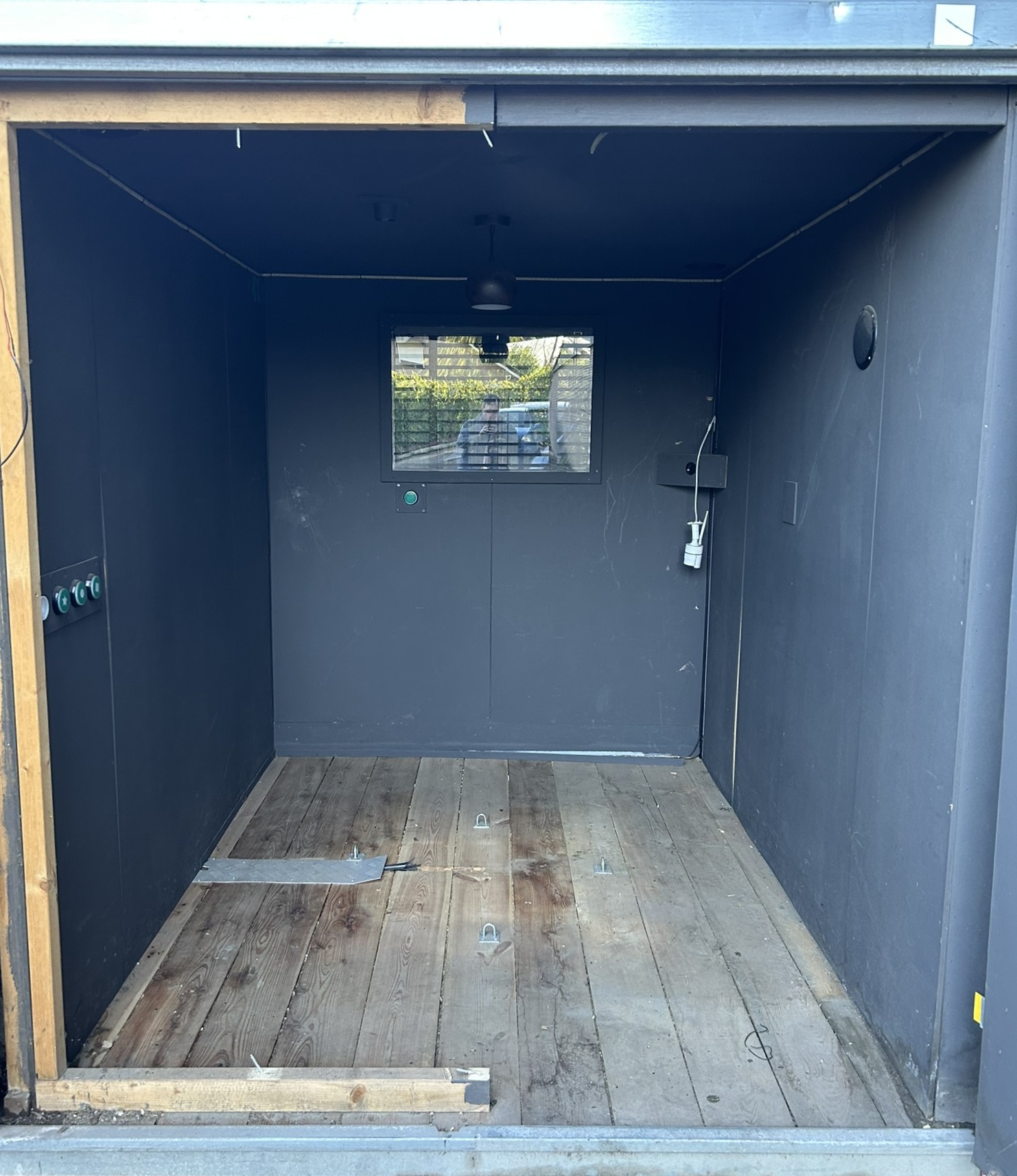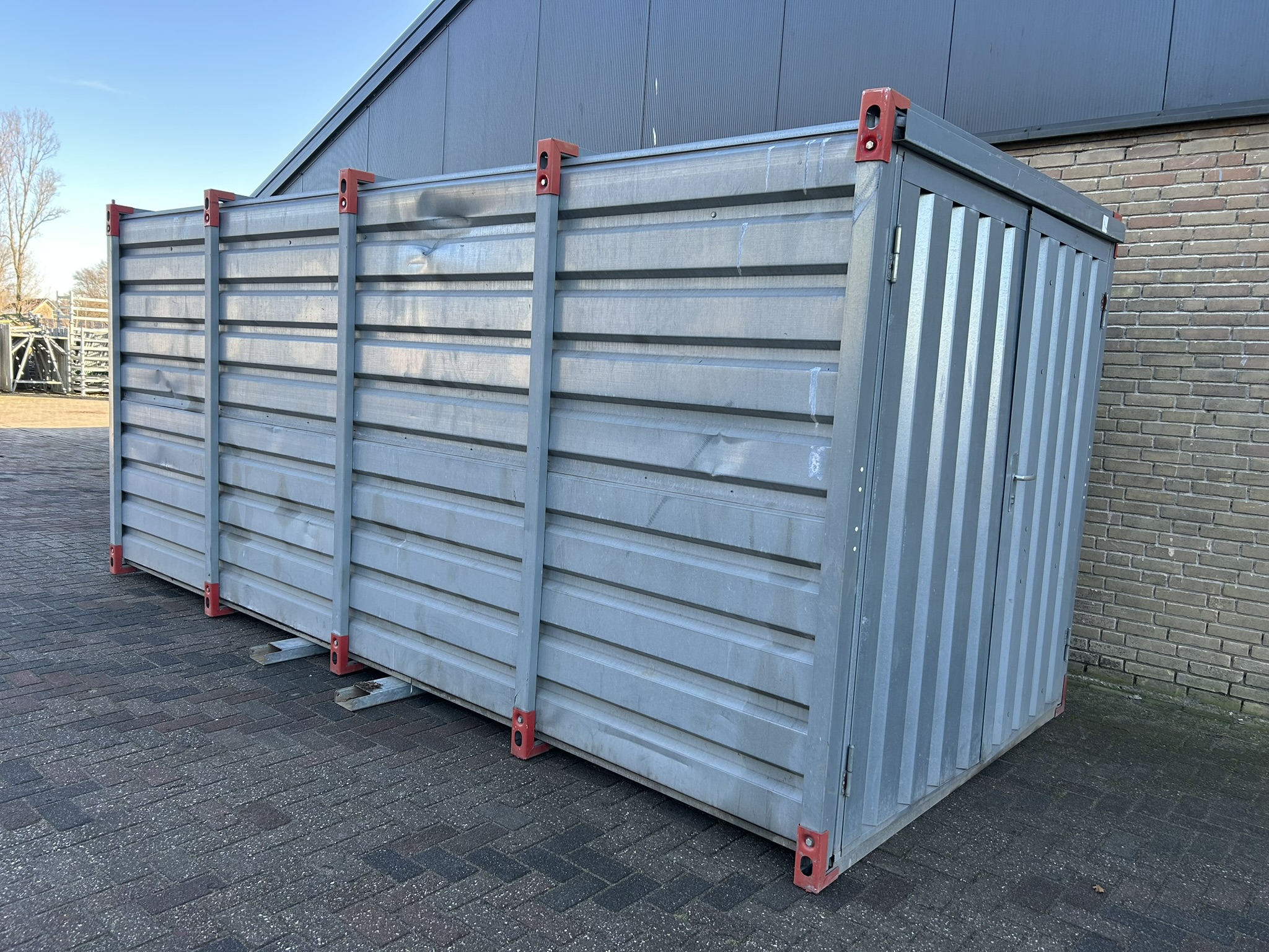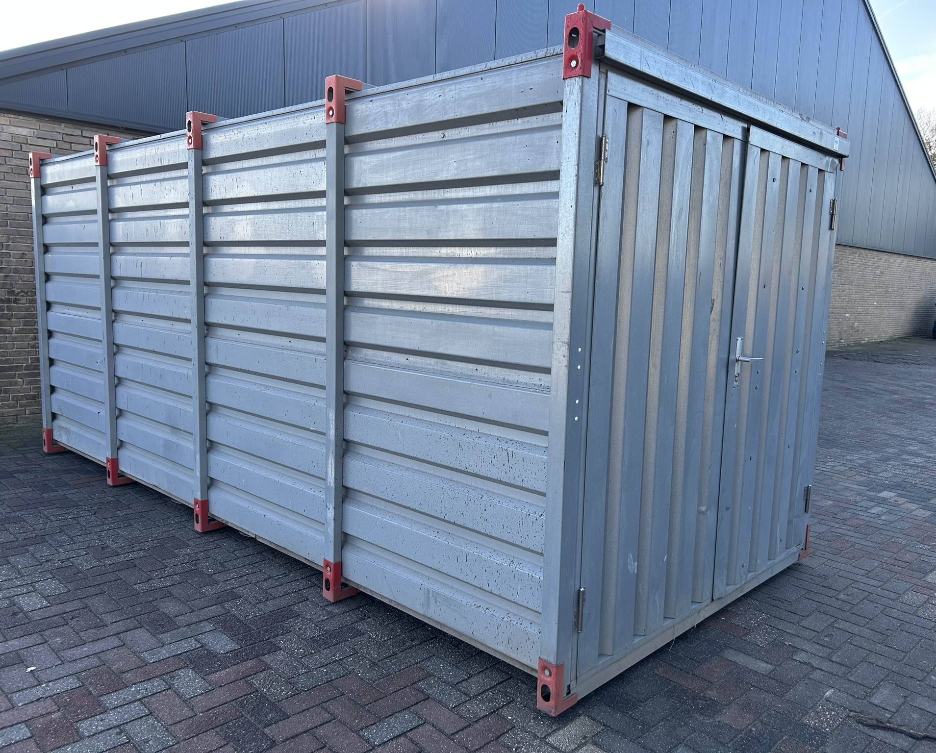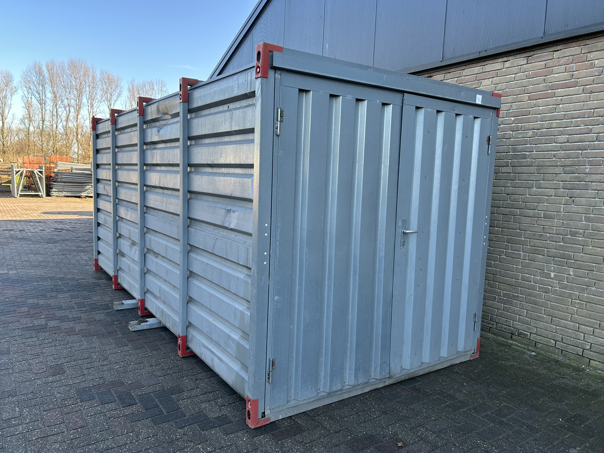 Unieke Kovobel materiaalcontainer omgebouwd tot (mobiele) werkplek, zowel aan de voor en achterzijde voorzien van dubbele deur met tussenwand zodat er 2 aparte ruimtes ontstaan.