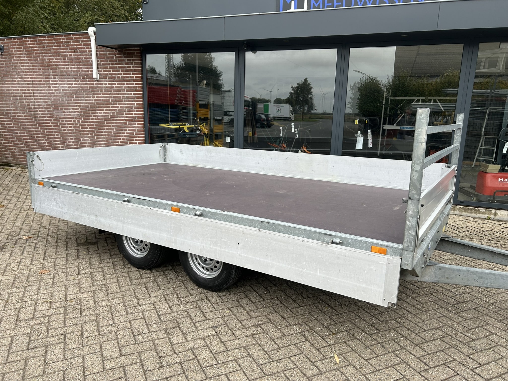 – 14 inch wielen, banden in nette conditie – Chassis volbad verzinkt – Aluminium borden 30CM kantelbaar/afneembaar – Nieuwe berken antislip laadvloer 15MM – 13-polige stekker – Nieuwe losbreek kabel – Breedte verlichting voorzijde – Goedwerkende verlichting – Goedwerkende remmerij – Nieuw zwaar opklapbaar neuswiel – Achterlichtbeschermers gemonteerd – 4x bind en spanogen per zijde in laadvloer – Koprek 80CM vanaf laadvloer – Laadvloerhoogte: 75CM – Afmetingen laadvloer: 406x204x30CM (LxBxH) – Afmetingen totaal: 565x211x160CM (LxBxH)