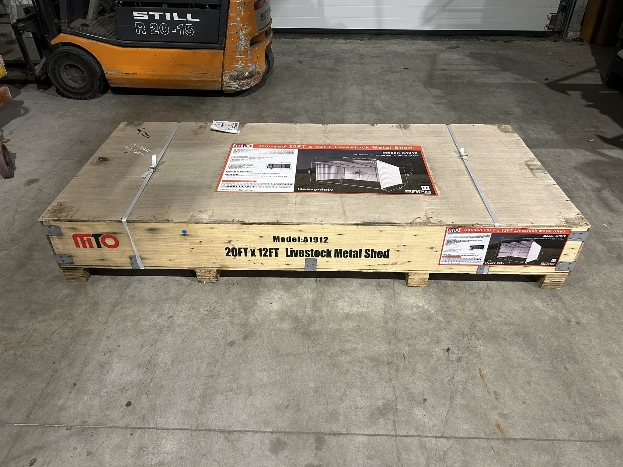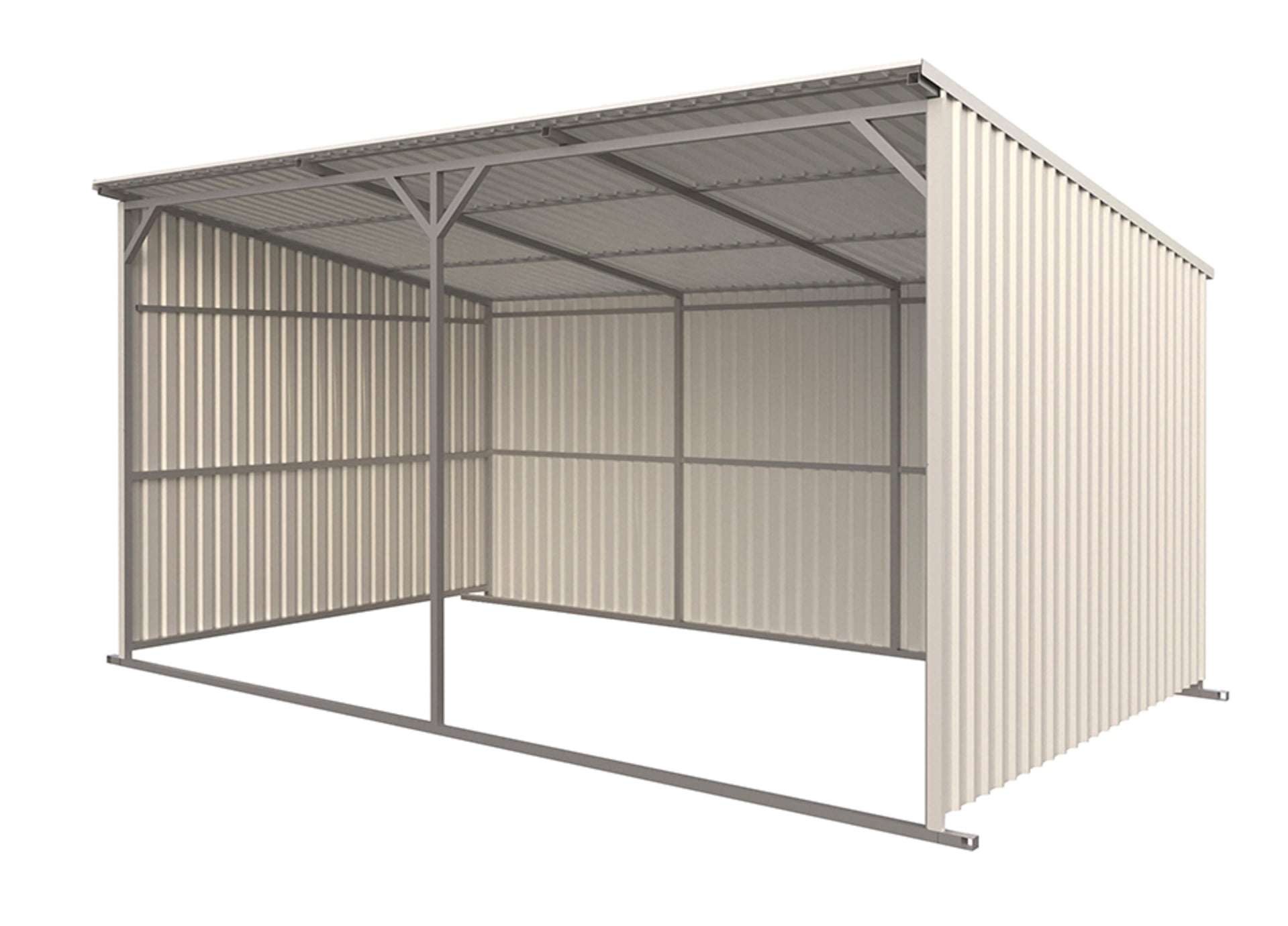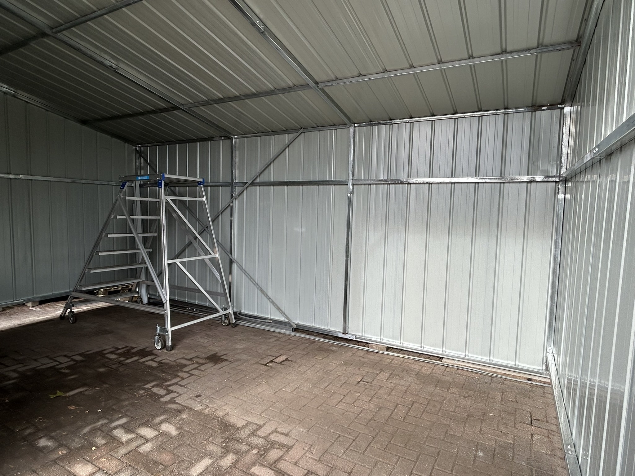 Nieuw in krat en eenmalig uit voorraad leverbaar, stalen damwand overkapping met open voorzijde, goed voor ruim 20M2 opslag van uw goederen.